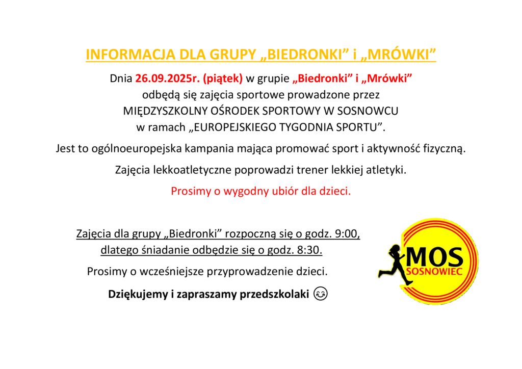Ogłoszenie dla grupy „Mrówki” i „Biedronki”