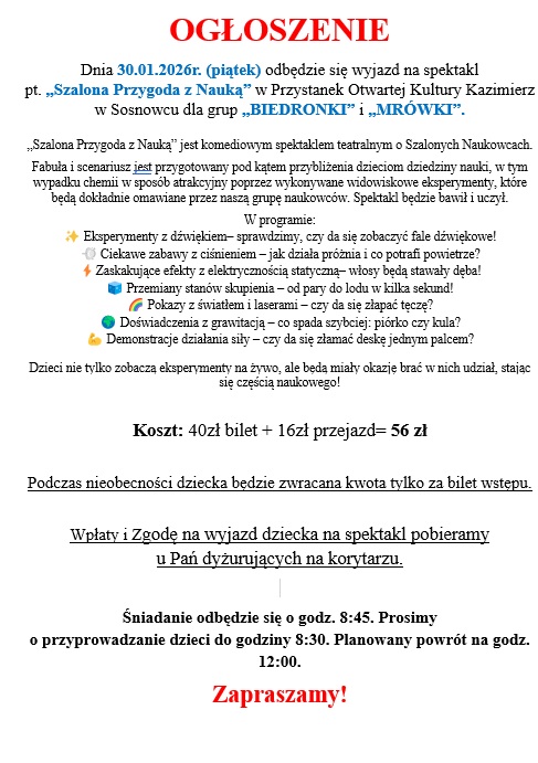 Ogłoszenie dla grupy „Mrówki” i „Biedronki”