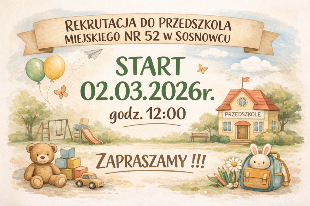 Informujemy, że od dnia 02.03.2026r. od godz. 12:00 rozpoczyna się REKRUTACJA DO NASZEGO PRZEDSZKOLA na rok szkolny 2026/2027 poprzez system elektroniczny:
