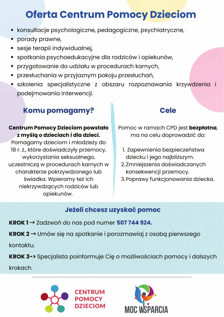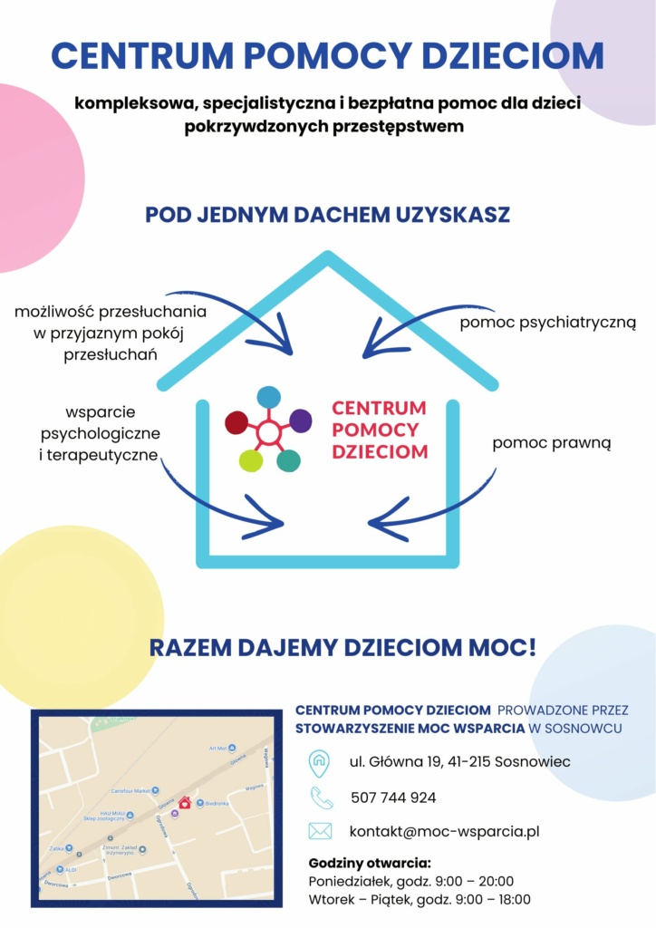 Stowarzyszenie prowadzi również CENTRUM POMOCY DZIECIOM, gdzie oferowana jest specjalistyczna pomoc i opieka.
