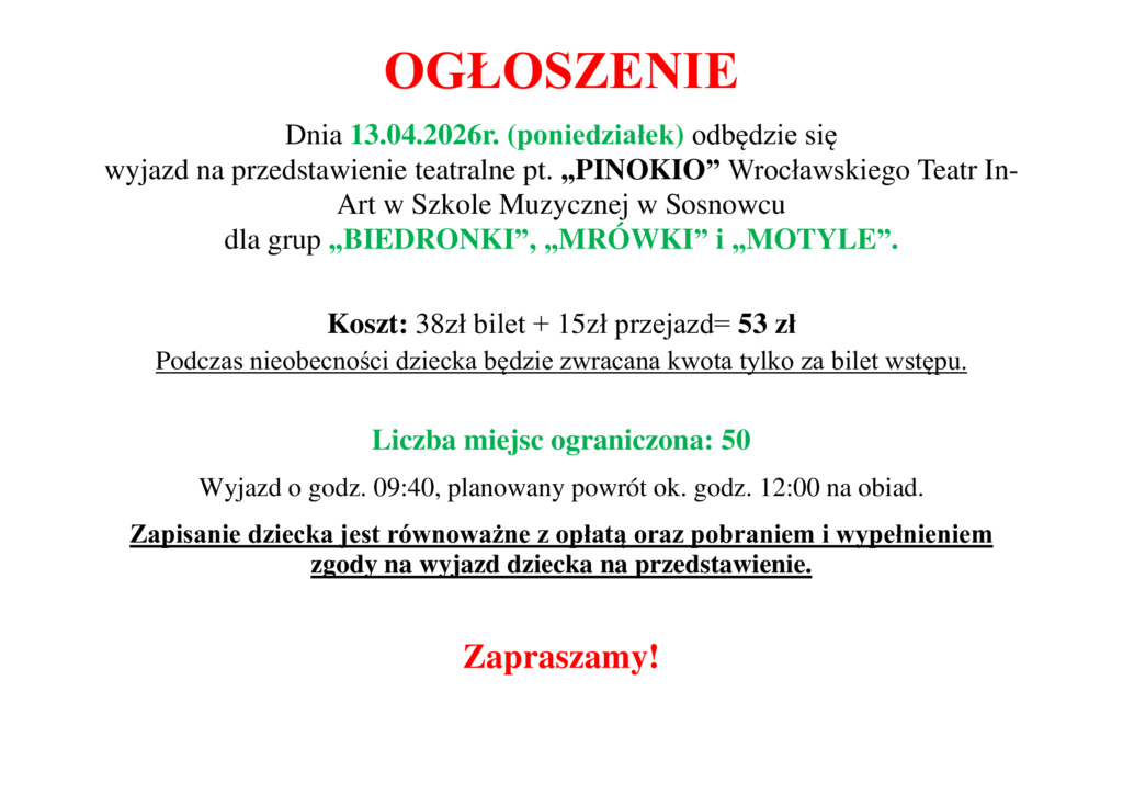 Ogłoszenie dla grup „Pszczółki” i „Motyle”