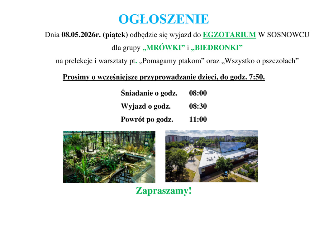 Ogłoszenie dla grupy „Mrówki” i „Biedornki”- Egzotarium