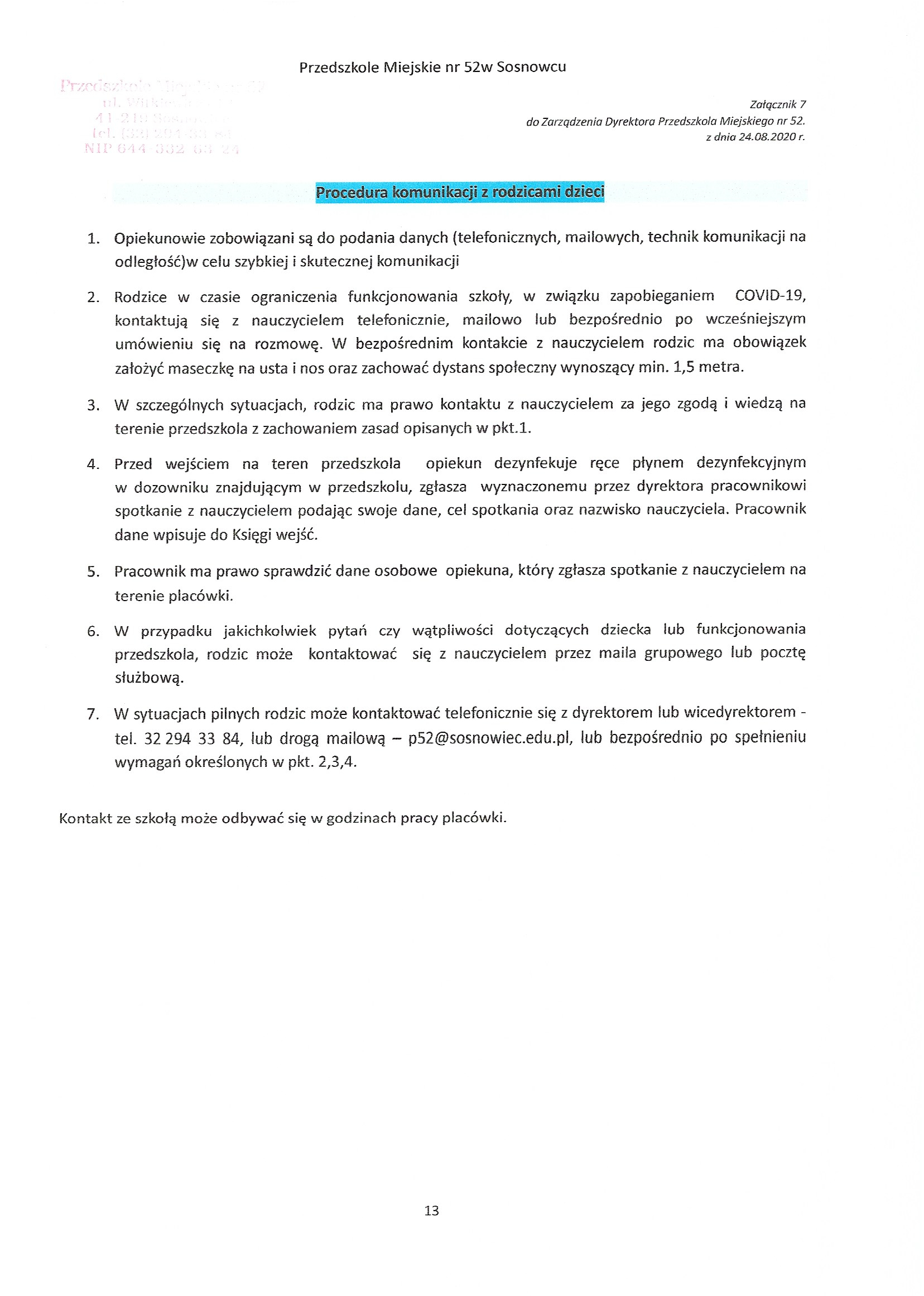 • Procedura bezpieczeństwa na terenie Przedszkola Miejskiego Nr 52 w okresie pandemii COVID-19