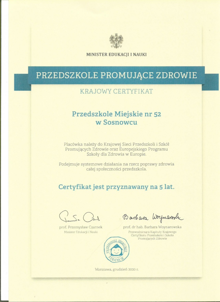 KRAJOWY CERTYFIKAT PRZEDSZKOLA PROMUJĄCEGO ZDROWIE.